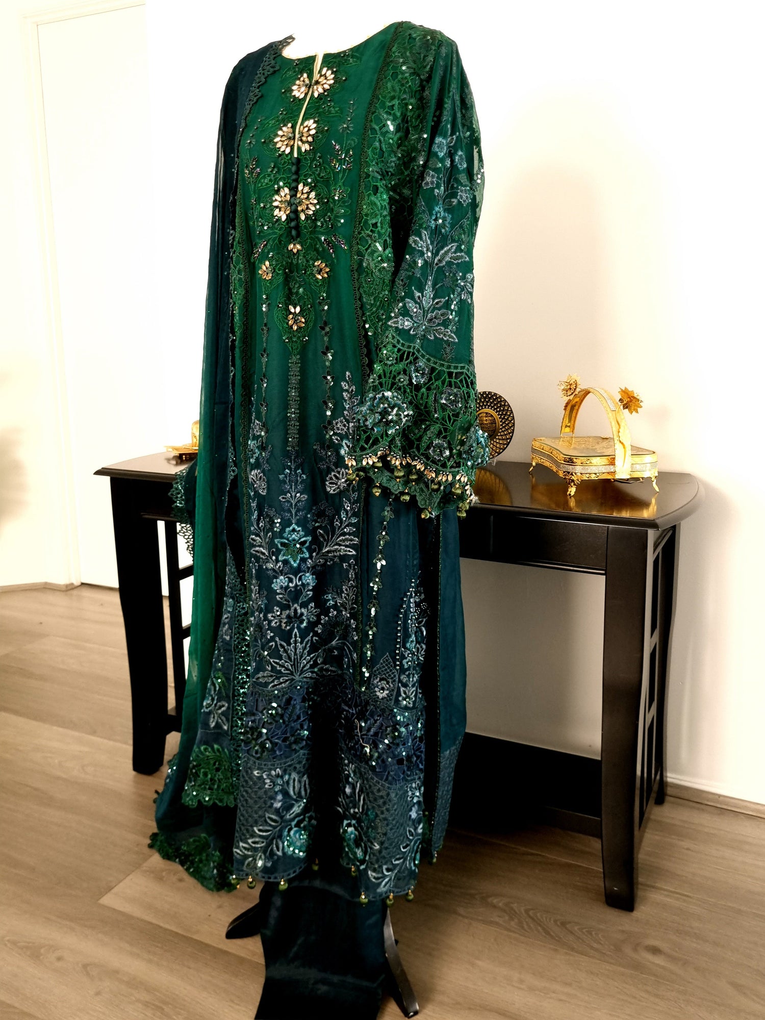 This bottle green chiffon dress is an eye-catching piece that is perfect for any occasion. Made with pure fabric and handwork detailing, it exudes elegance and sophistication. Accompanied by a chiffon duppata and silk trouser, this dress provides a well put-together look. Elevate your style with this stunning and versatile dress.
