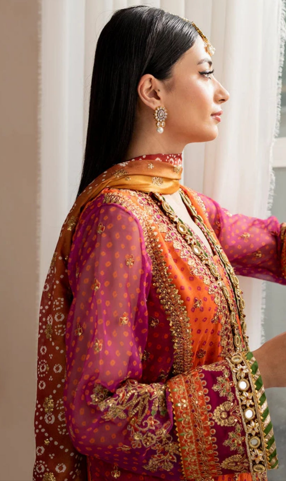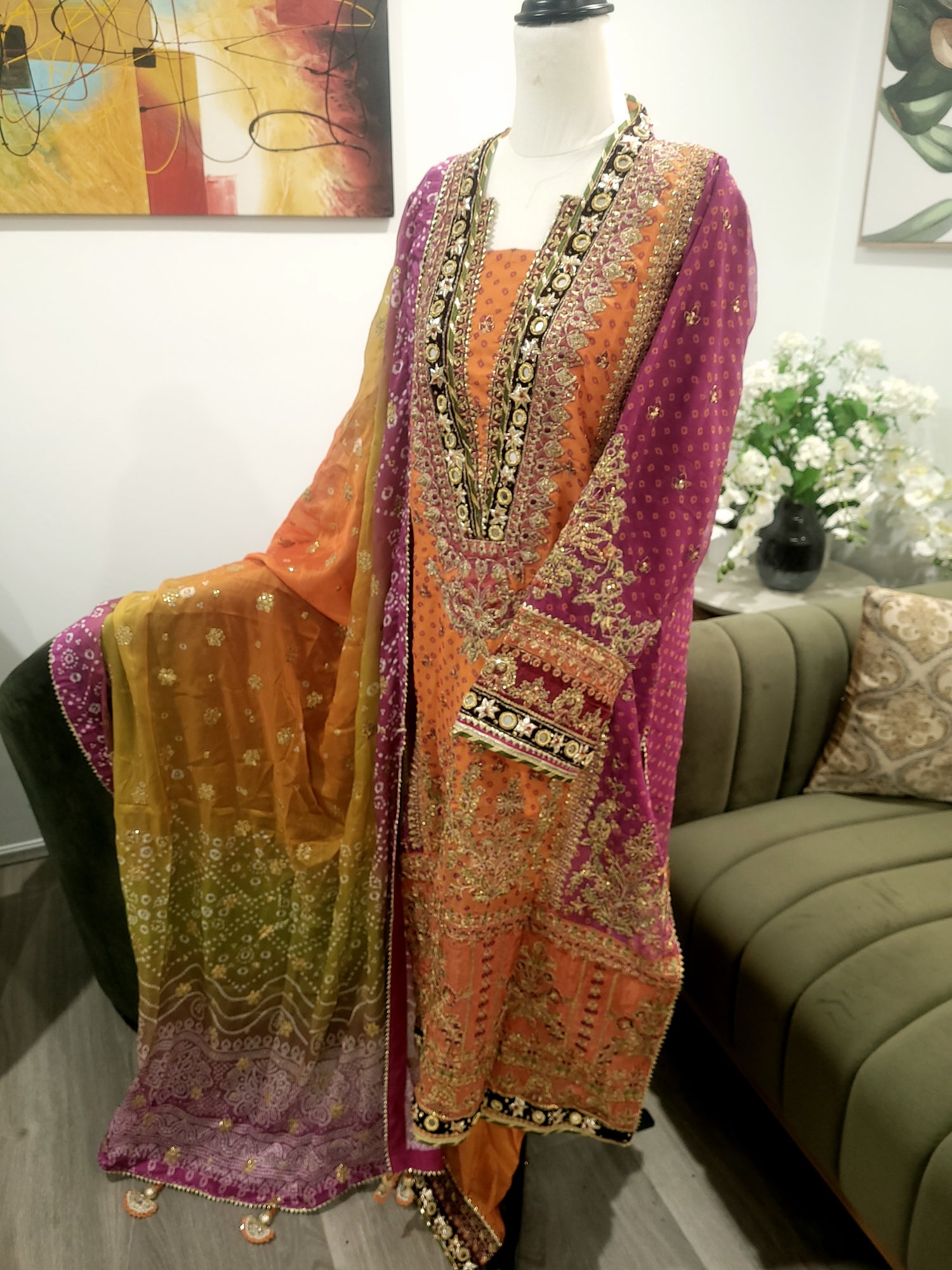 This rust and magenta chiffon dress is perfect for any occasion. Its intricate embroidery adds a beautiful touch while the lightweight fabric ensures comfort. Elevate your style with this 3-piece set.