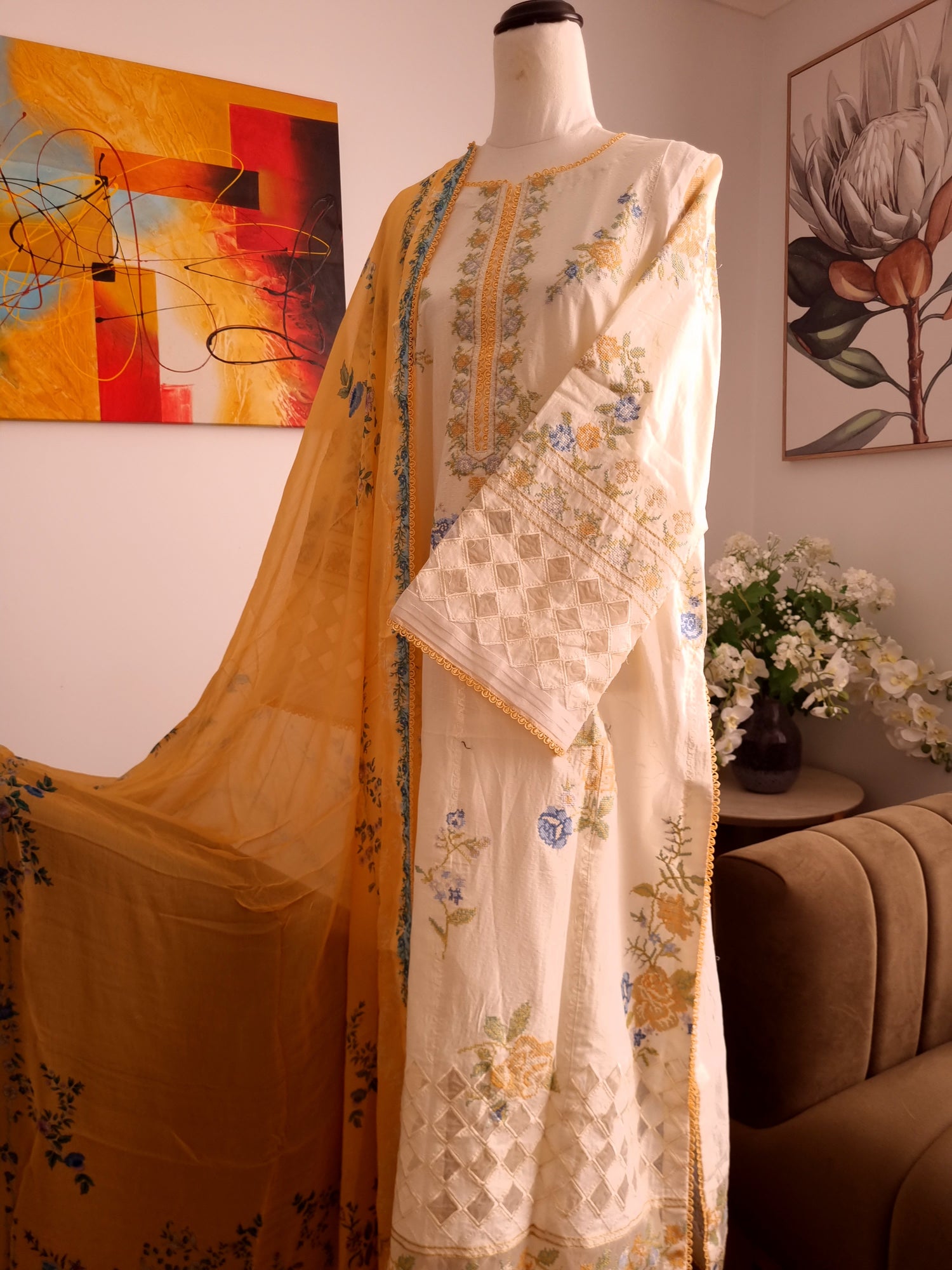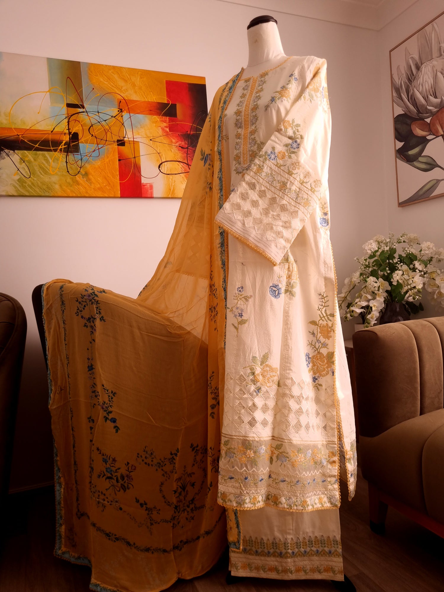 The Solace summer luxury 3pc set is perfect for those warm weather gatherings. This beautiful dress features intricate embroidery, paired with a chiffon duppata and embroidered plazoo. Ideal for light parties, this set will elevate your summer wardrobe.