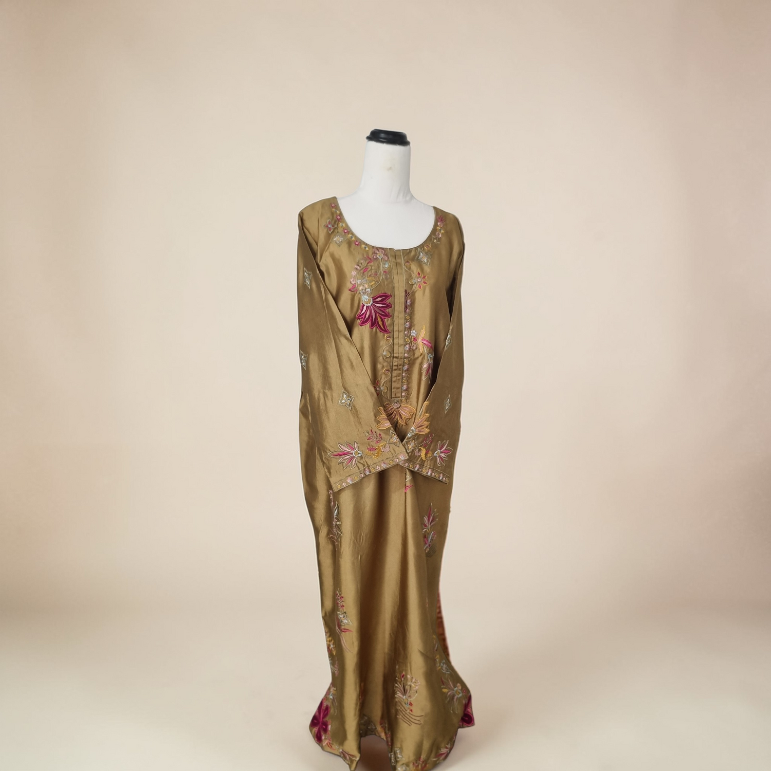 The Olive Golden is a kaftan crafted from pure sheesha silk, featuring intricate reasham embroidery. This design not only enhances aesthetic appeal but also provides lightweight comfort, making it suitable for various occasions. The combination of high-quality materials ensures durability and elegance in presentation.
