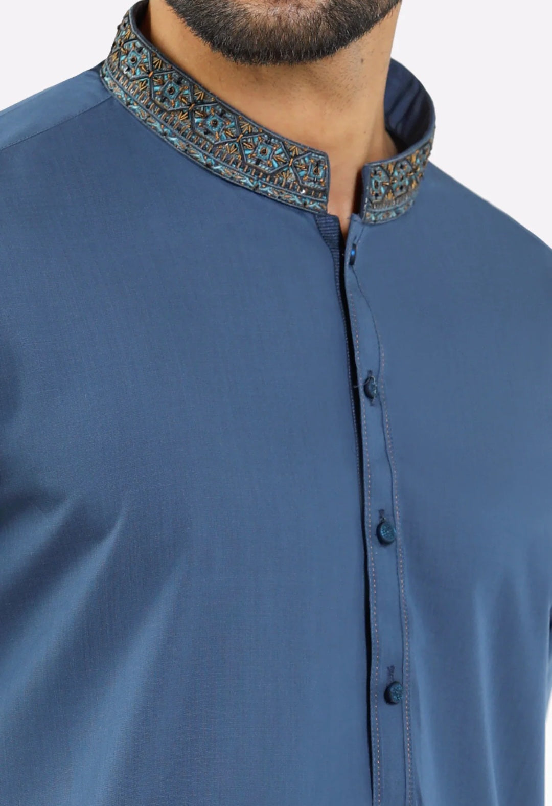 Effortlessly elevate your style with our Dark Blue Mens 2pc set. Made from wash & wear fabric with intricate embroidery, this kameez shalwar is perfect for any occasion. Stay comfortable and effortlessly stylish in this must-have addition to your wardrobe.